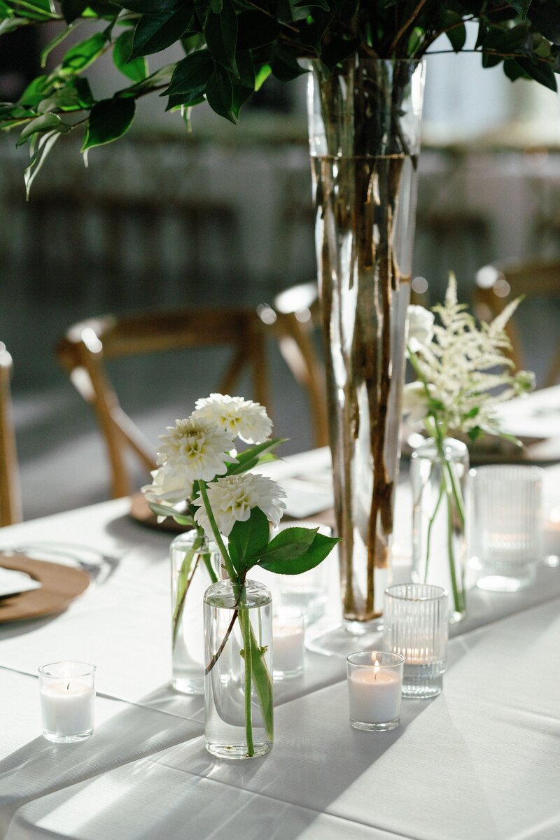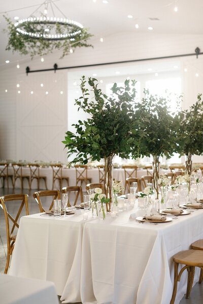 This late spring wedding was a dreamy take on classic white and green. Airy clouds of baby's breath lined the aisle, later repurposed into delicate garlands for the guest tables. A stunning arch and cascading greenery softened the grand white barn, climbing the walls and chandeliers to create a romantic, modern, and whimsical atmosphere.